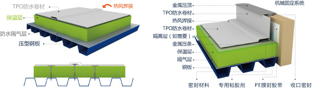 在工程應(yīng)用中,TPO防水卷材具有抗老化、拉伸強(qiáng)度高,伸長(zhǎng)率大、潮濕屋面可施工、可用于外露工程、施工方便、無(wú)污染等綜合特點(diǎn),十分適用于作為輕型節(jié)能屋面的防水層。